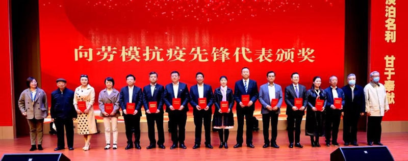 (許鵬(右七)、魏國(右三)被授予“勞模抗疫先鋒”稱號)