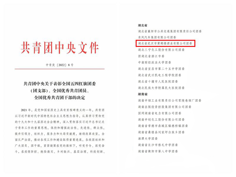 2022年是中國共青團(tuán)成立100周年。近日,共青團(tuán)中央作出表彰決定,頒發(fā)全國五四紅旗團(tuán)委、全國五四紅旗團(tuán)支部、全國優(yōu)秀共青團(tuán)員、全國優(yōu)秀共青團(tuán)干部等榮譽(yù)稱號。其中,共青團(tuán)黃鶴樓酒業(yè)有限公司委員會獲評全國五四紅旗團(tuán)委稱號。