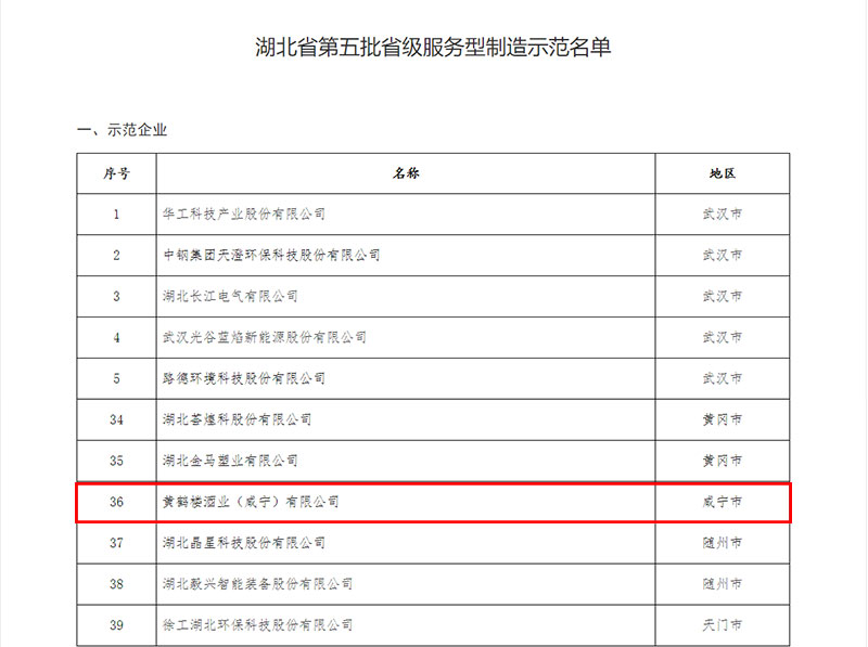 5月30日,湖北省經濟和信息化廳公布第五批省級服務型制造示范名單。黃鶴樓酒業(咸寧)有限公司獲評第五批省級服務型制造示范企業。
