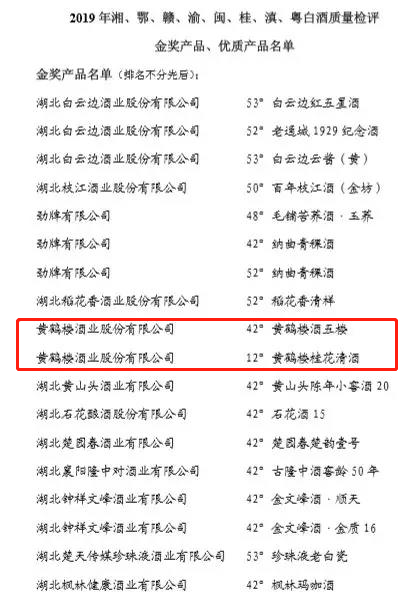 近日,在第十一屆酒類質量檢評會上,黃鶴樓酒業“42%vol黃鶴樓五樓”榮獲“2019年湘鄂贛渝閩桂滇粵白酒質量檢評信得過金樽獎”稱號,“12%vol黃鶴樓桂花清酒”榮獲“2019年湘鄂贛渝閩桂滇粵白酒質量檢評金獎”稱號。